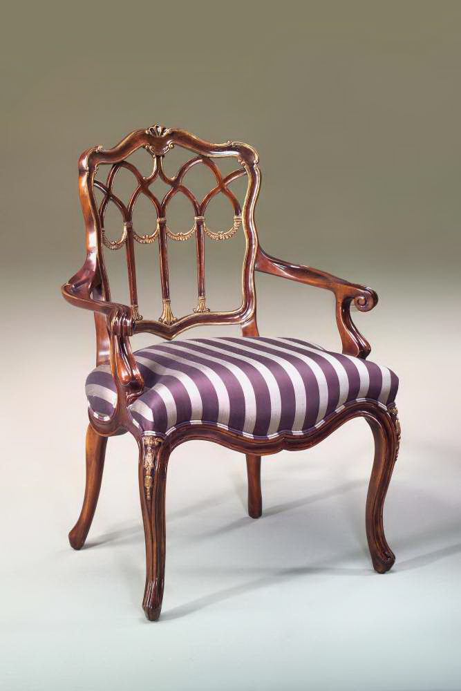 Althorp finely hand carved and gilt Gothic revival armchair, the serpentine back enclosing interlacing Gothic arches, scroll arms . The original George II in the Librar