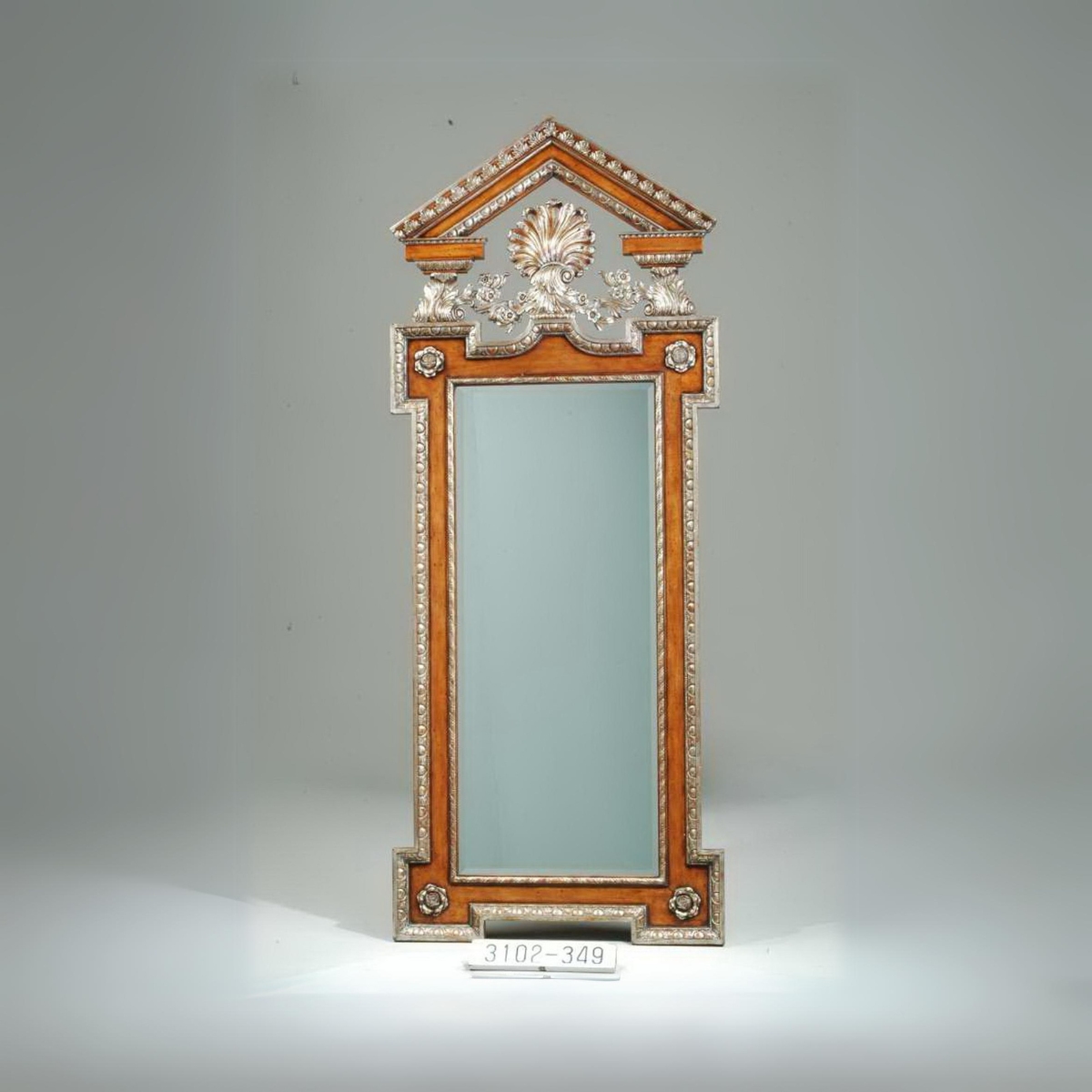 Althorp mahogany and silvered wall mirror in the manner of William Kent, hand carved architectural frame surmounted by a pediment enclosing floral and shell motifs. The original George III