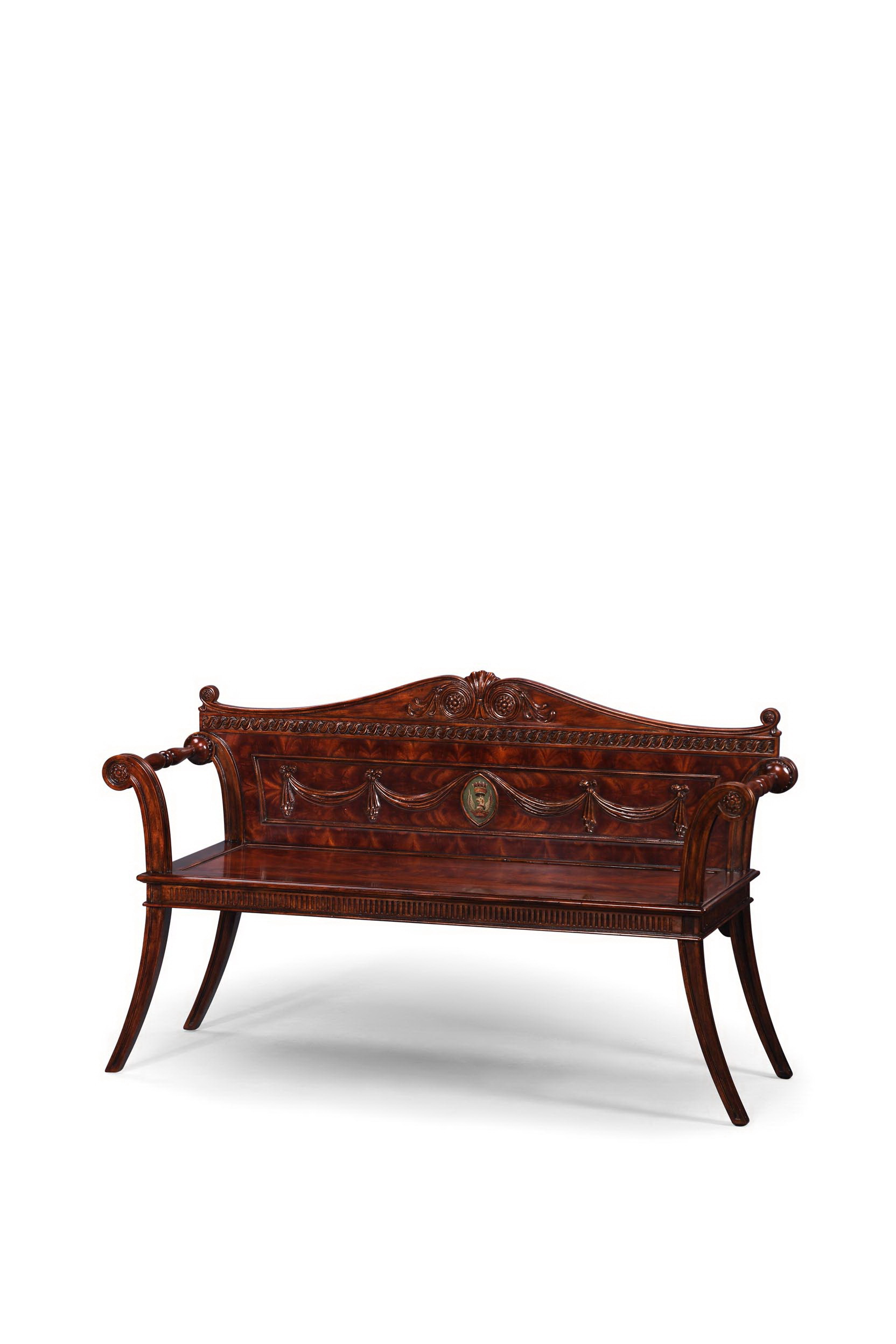 Althorp unusual mahogany bench, hand carved, back centered by the spencer crest