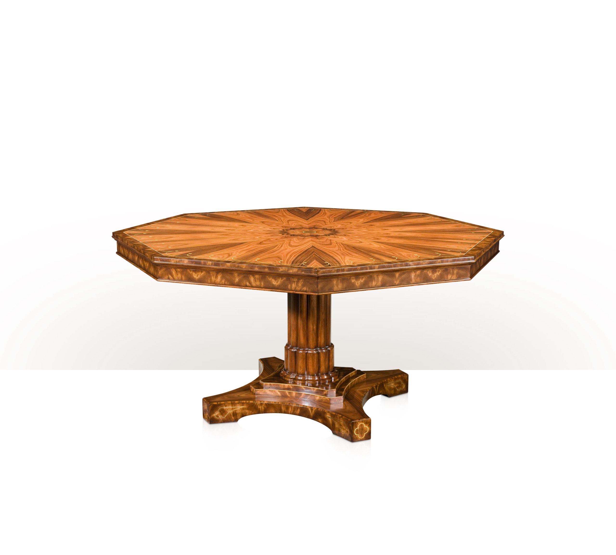 Althorp rosewood and flame mahogany veneered octagonal dining table, brass line inlaid top above a plain frieze