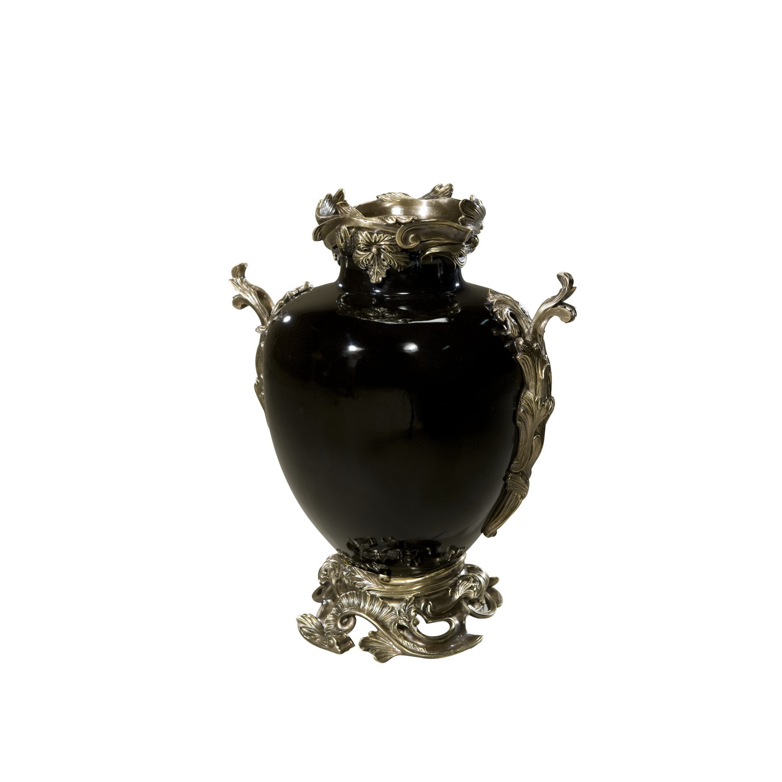 Althorp finely cast brass mounted and black ceramic vase.Inspired by a Louis XV Rococo original