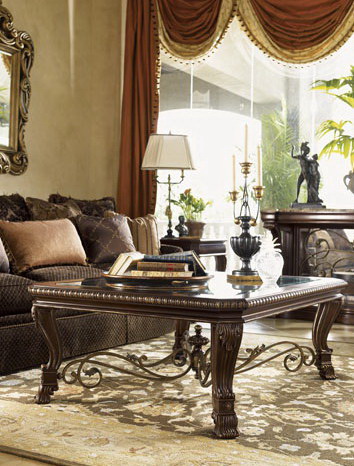 Trump Home Mar-a-Lago collection rectangular cocktail table glass top,scrolled metalwork