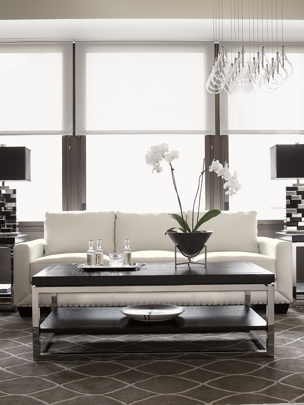 Lexington Black ice collection rectangular cocktail table silver finished metal base, wood top with silver inlay