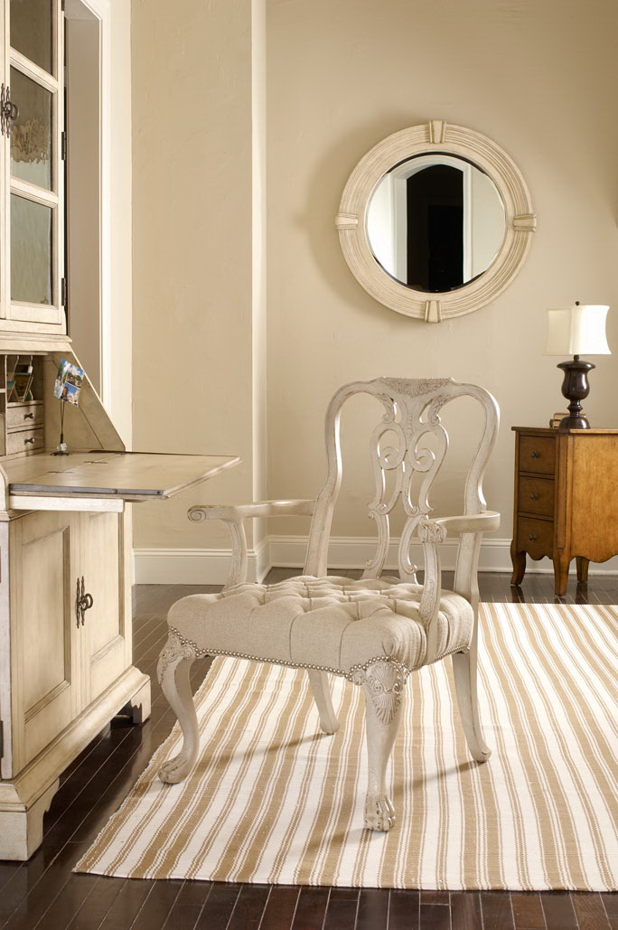 Lexington Twighlight Bay collection carved back splat armchair , driftwood finish, linen fabric