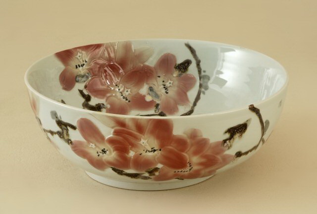 Maitland Smith light celadon porcelain bowl, raised hand painted floral decoration