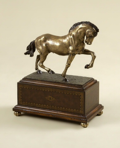 Maitland Smith antique brass and dark bronze finished horse, aged regency and leather base