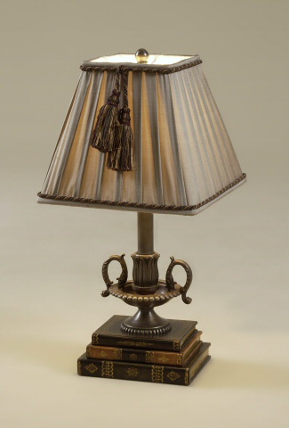 Maitland Smith dark antique brass finished tazza table lamp with stacked book motif, silk shade