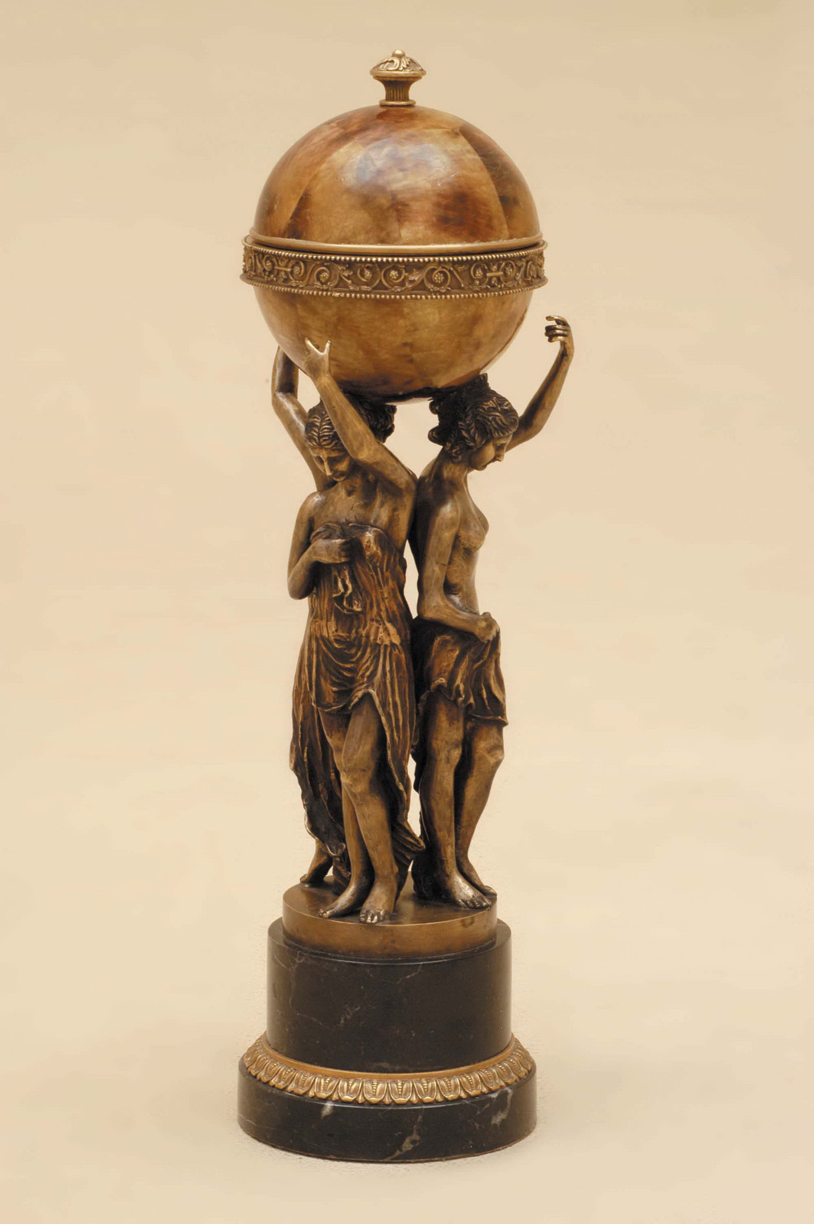 Maitland Smith brass ladies holding tiger penshell inlaid round box, stone base, black accents