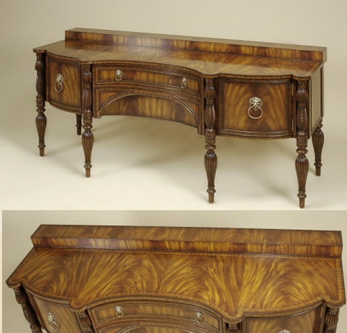 Maitland Smith carved aged regency finished sideboard crotch mahogany veneer, brass accents
