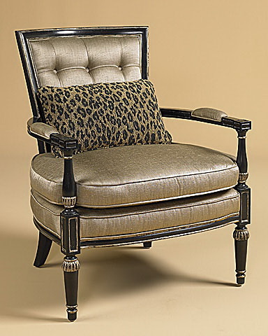 Maitland Smith dark tone finished occasional chair, painted gilded accents, silk fabric upholstery