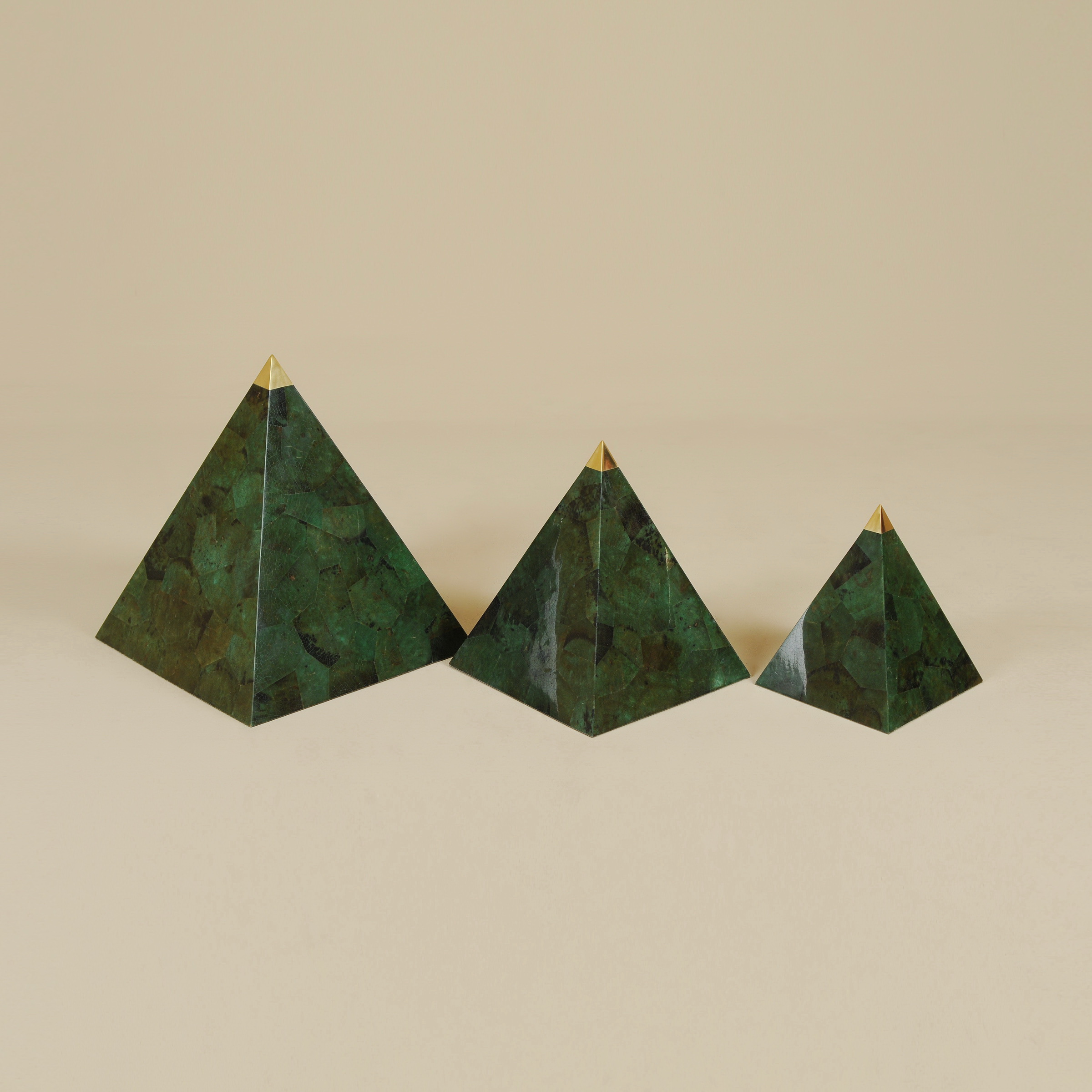 Maitland Smith Set of Three Emerald Green Penshell Inlaid Pyramids with Brass Accents