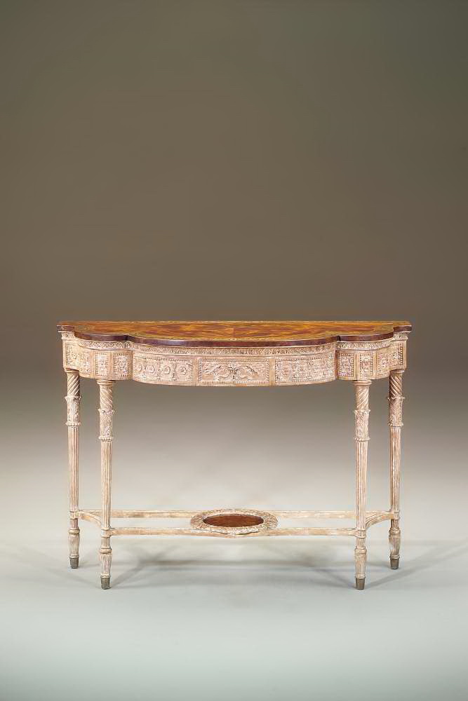 Replica finely carved limed wood painted serpentine console, mahogany and finely scrolling brass marquetry leaf inlaid top