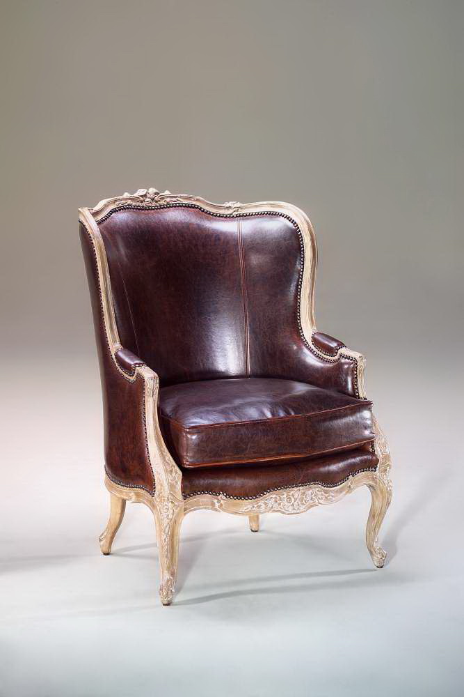 Theodore Alexander Limed wood and floral carved wing armchair, serpentine padded back, cushion seat, carved cabriole legs. Original Louis XV circa 1760