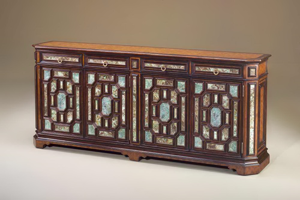 Theodore Alexander Pollard burl and black rubbed-through buffet,turquoise stone panels