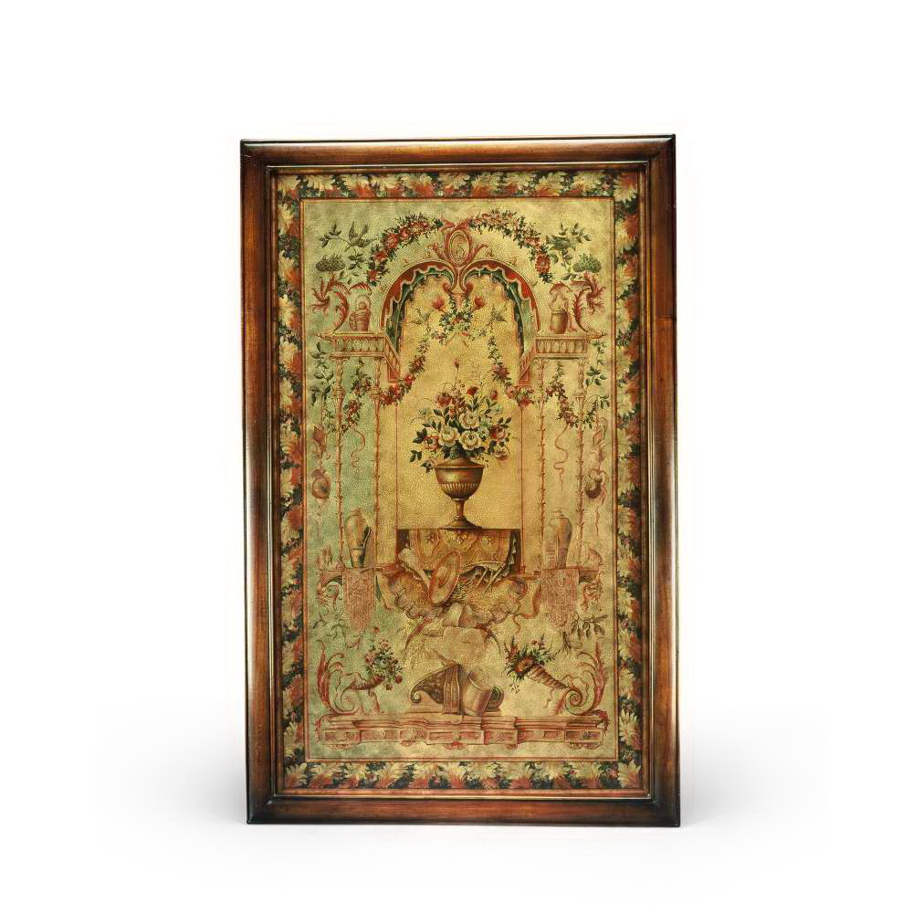 Theodore Alexander Neo-classical découpage wall hanging découpage panel , vase with flowers surrounded by arch and cornucopias within a moulded frame. The original George III.