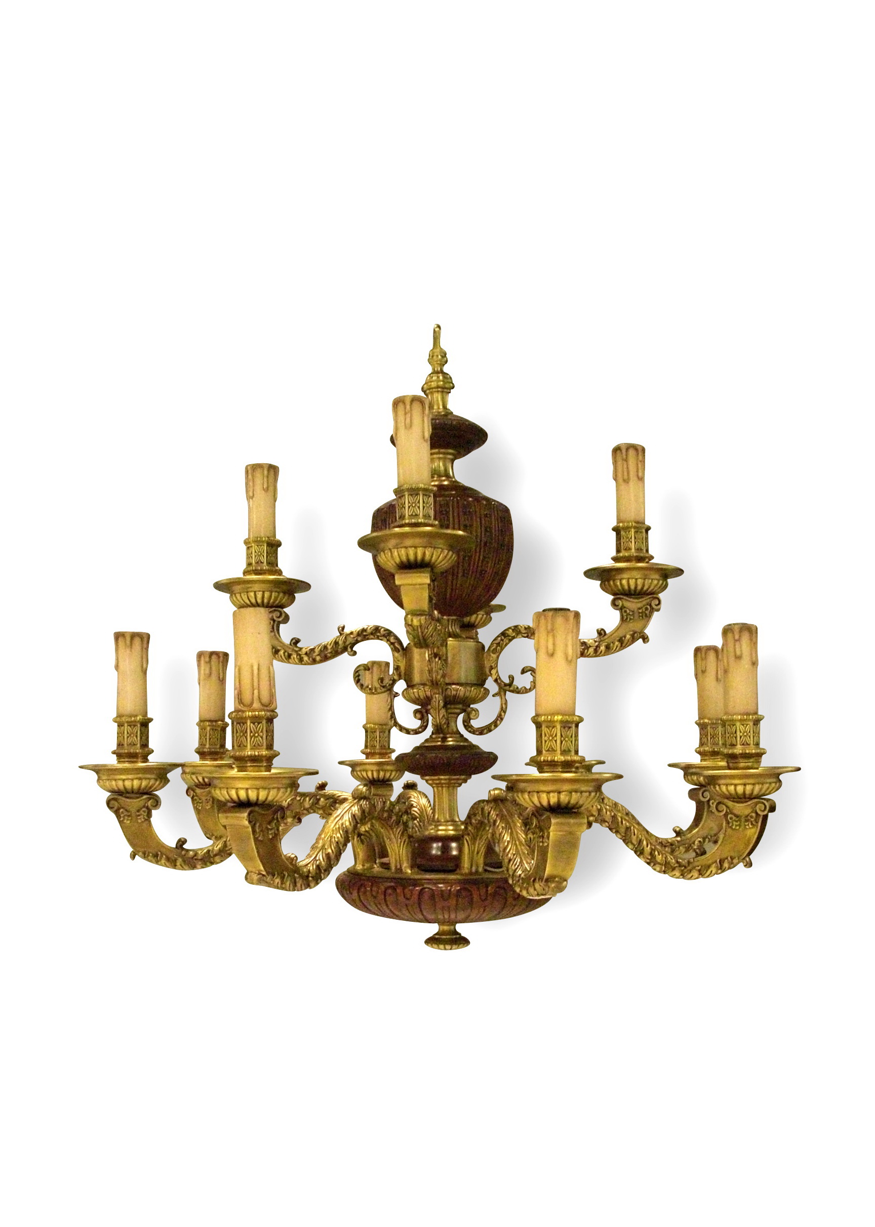 Theodore Alexander fineleyc ast brass and mahogany 12light chandelier.