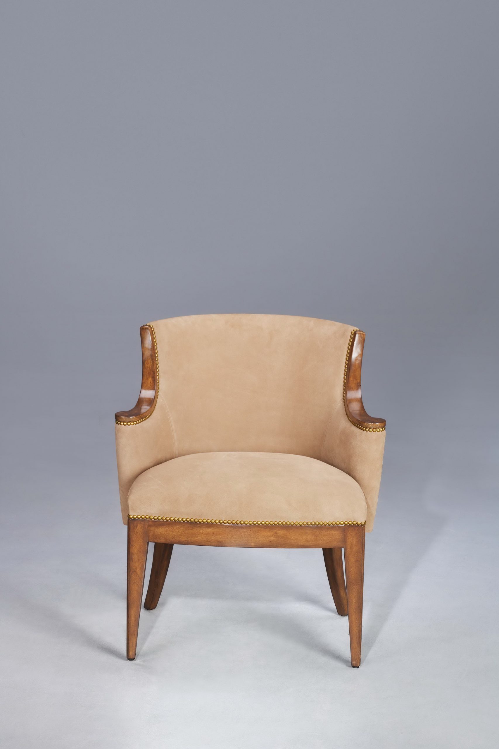 Theodore Alexander Art Deco suede armchair, arched back, out scrolled arms, on square tapering legs. The original circa 1930