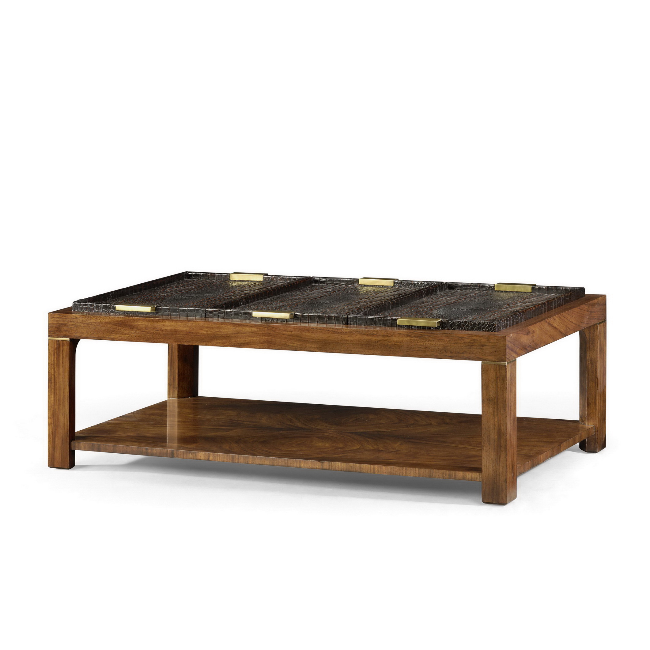 Theodore Alexander walnut cocktail table, top with three kalahari trays with brass handles