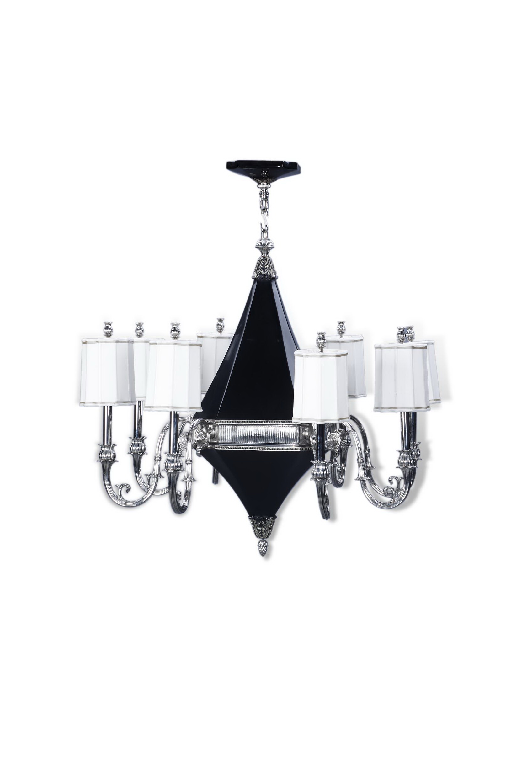 Theodore Alexander transitional black lacquer and stainless steel eight light scroll arm chandelier