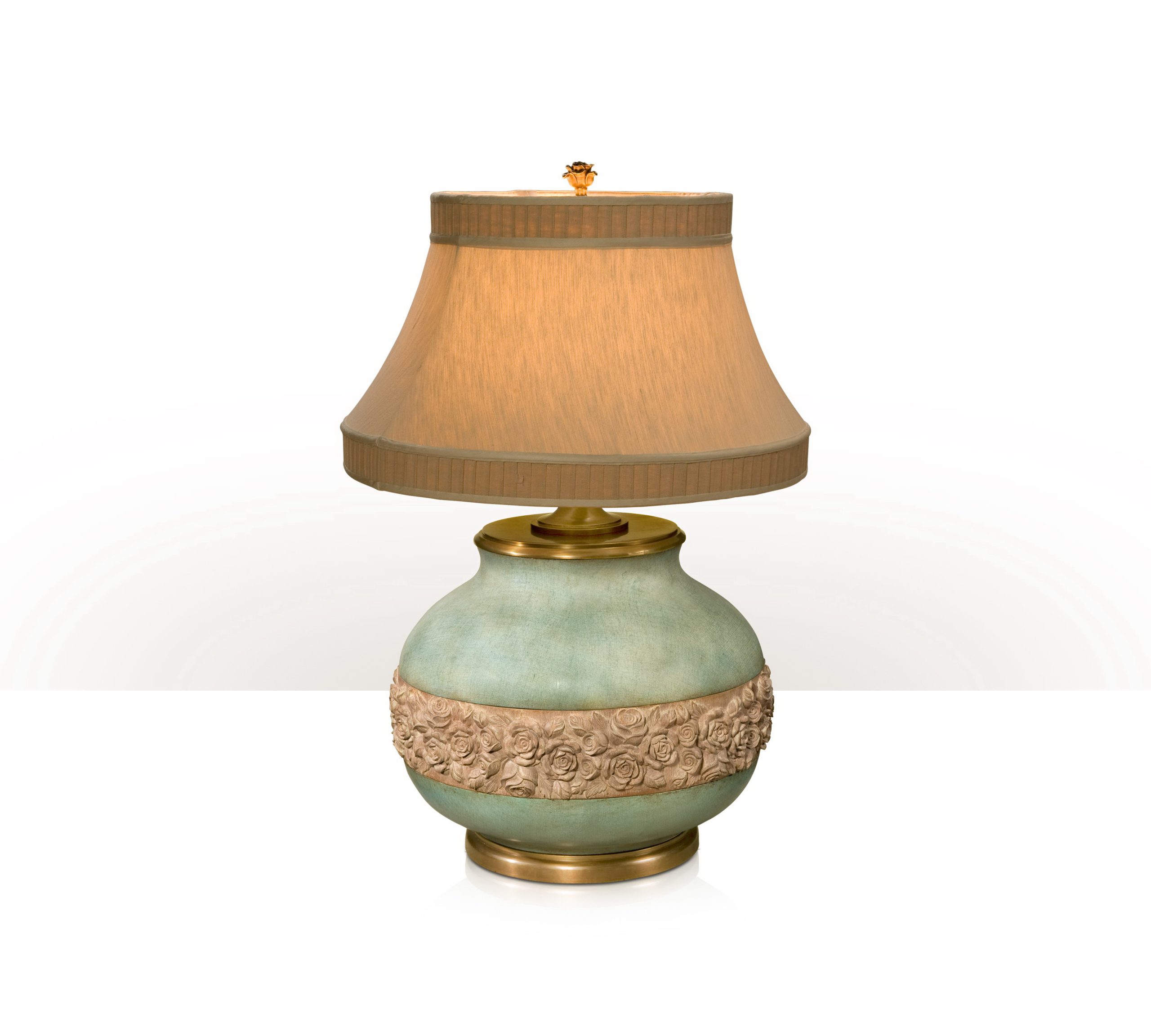 Theodore Alexander turquoise painted table lamp, hand carved oak band of roses, brass base