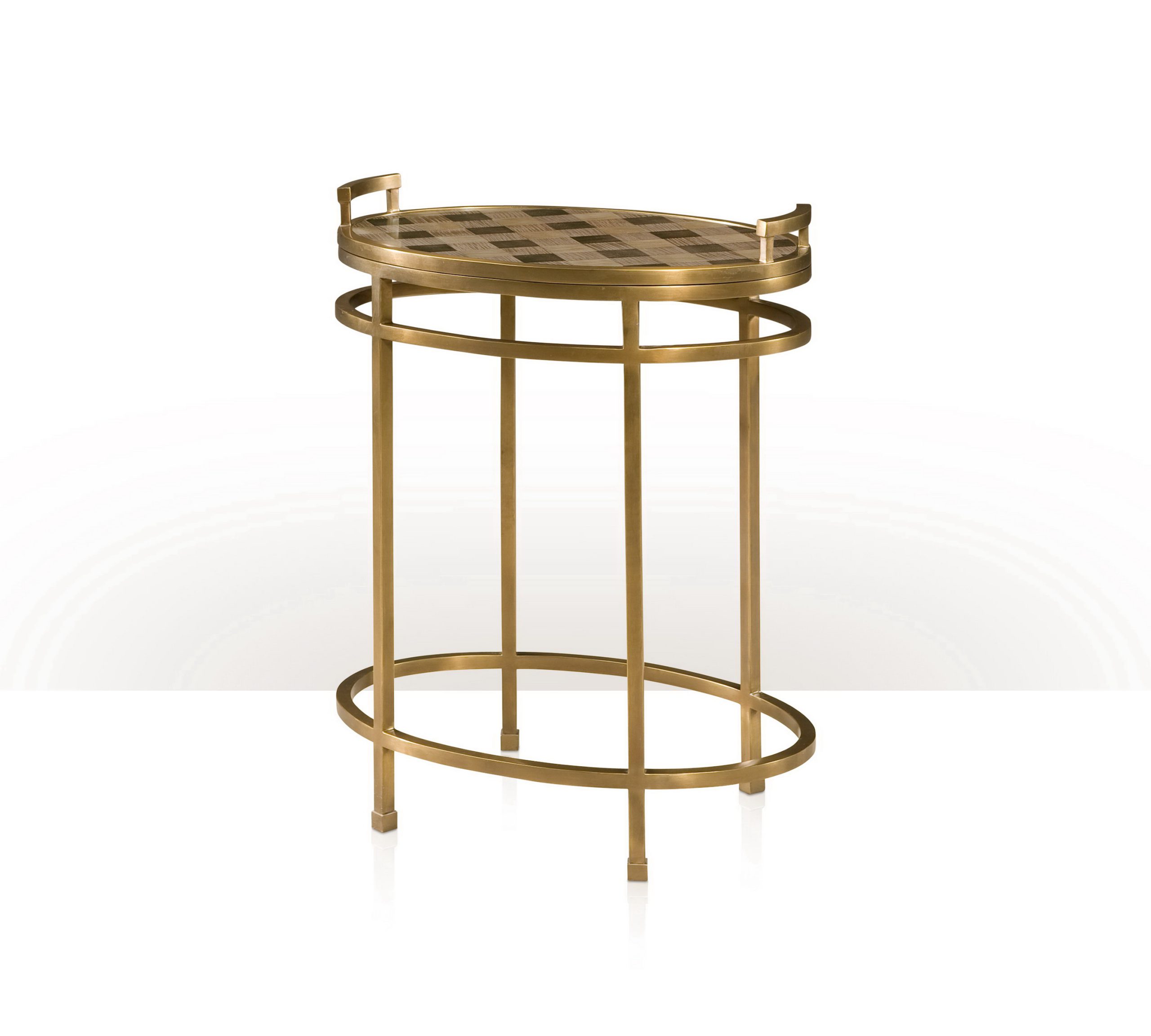 Theodore Alexander brass and platinum sycamore oval lamp table, lift off tray top sith a tartan pattern