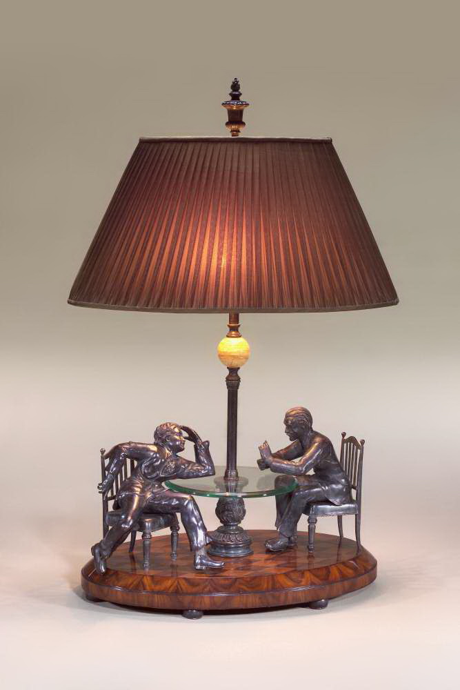Theodore Alexander brass and rosewood table lamp, the oval rosewood veneered base of two men seated at a glass table, surmounted by an onyx ball and a pleated and hand sewn silk shade with a flaming urn finial. The original 19th century English.