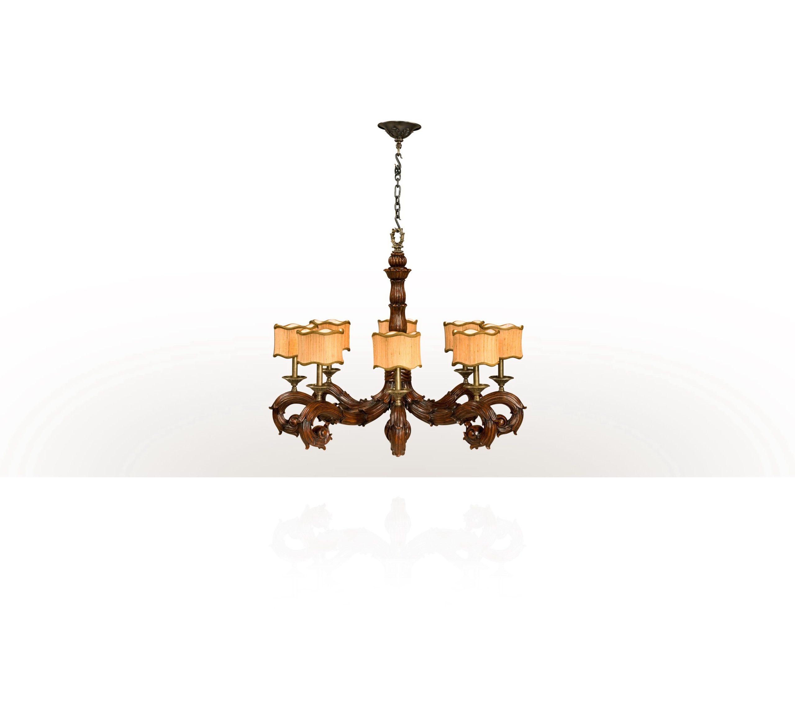 Theodore Alexander finely hand carved mahogany eight light chandelier, hand sewn silk shades