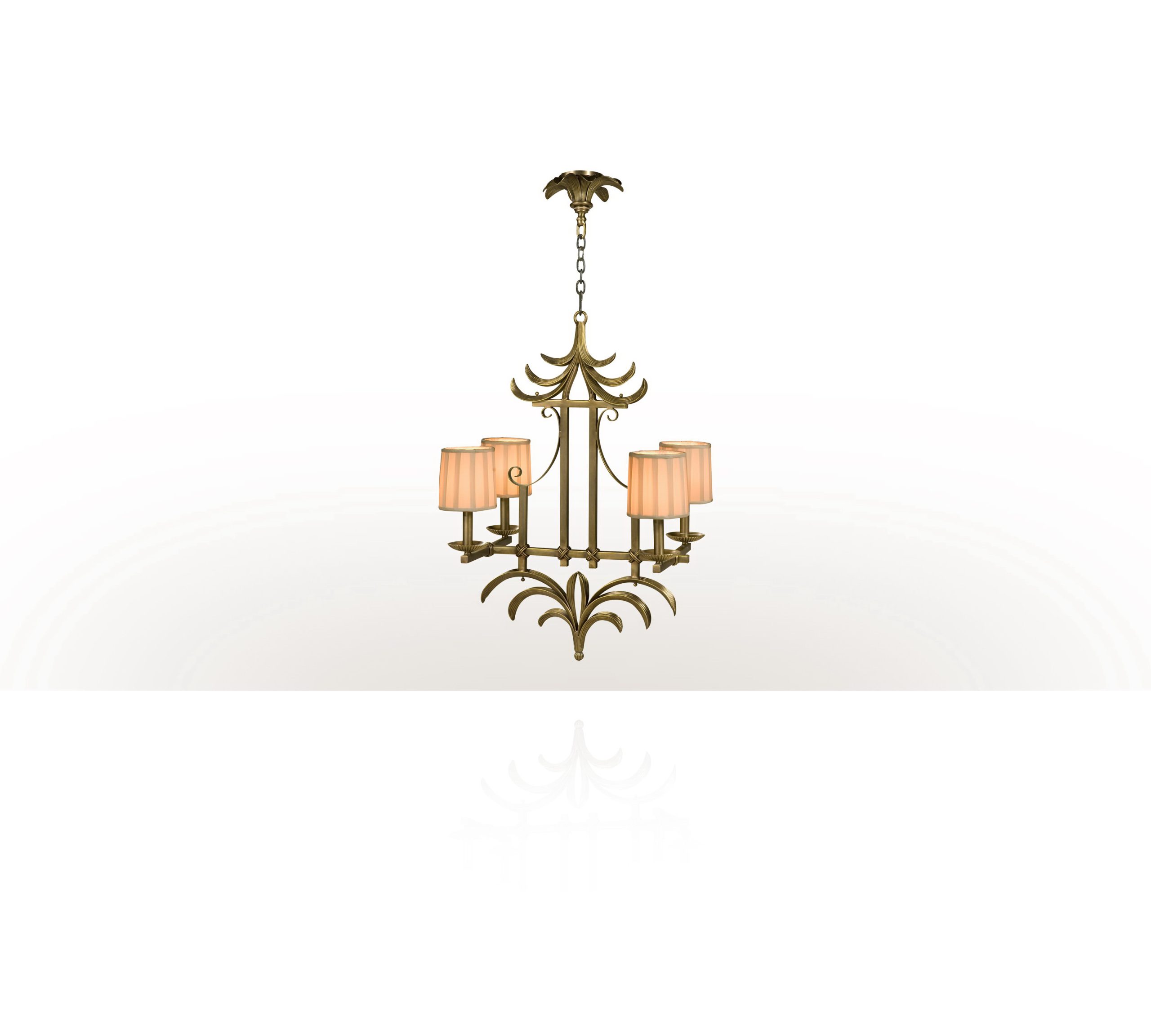 Theodore Alexander finely cast brass pagoda chandelier, with hand sewn silk shades