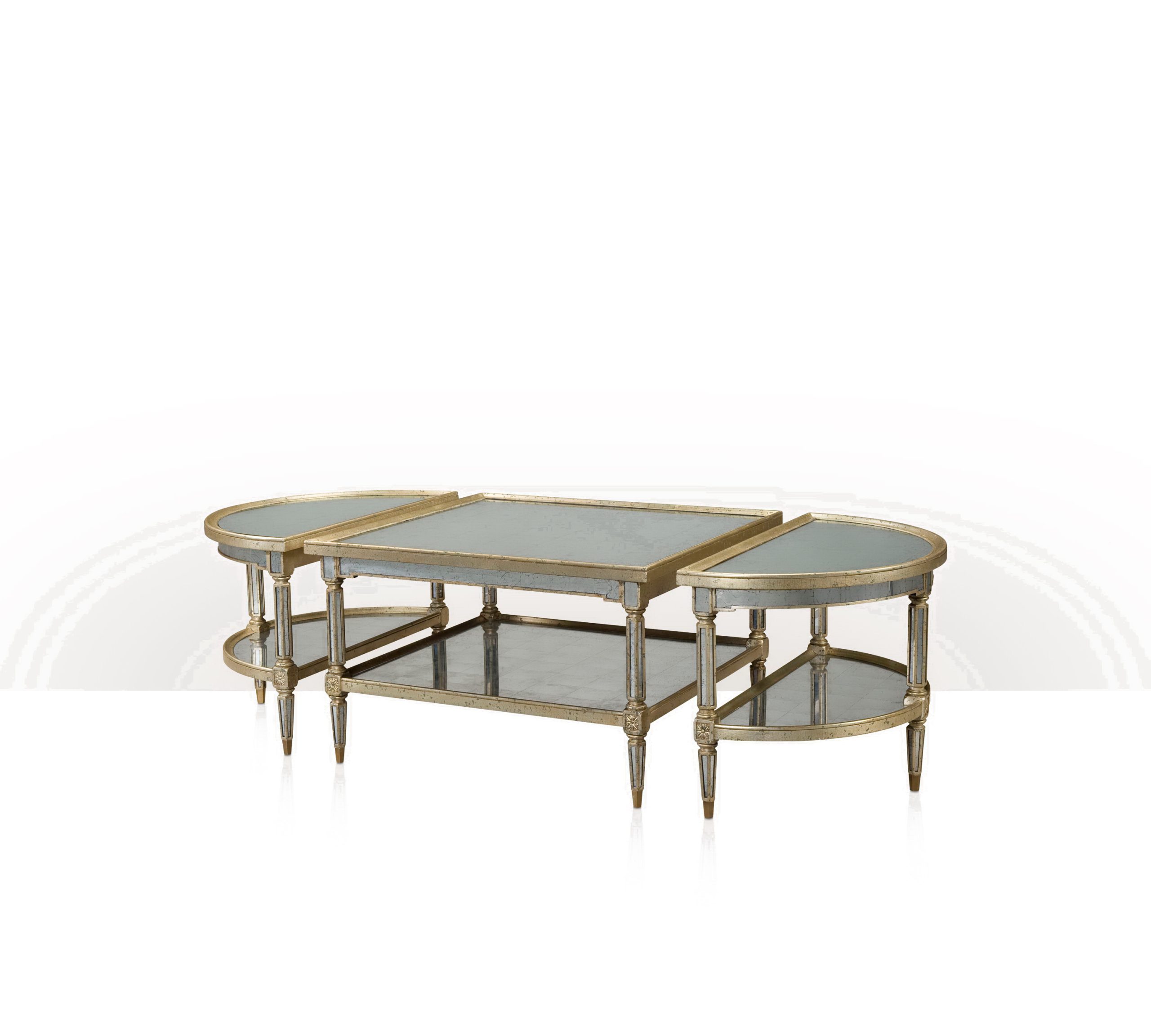 Theodore Alexander silver leaf and antiqued mirrored cocktail table in three parts